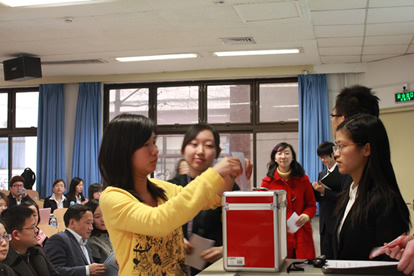 首先,两位副主席候选人进行了各具特色的风采展示并接受现场代表的提问,阐述了他们对员工会工作的理解,表达了他们为同学服务的热情。最终,高渊同学获得77票,胡凌琳同学获得48票,都以超过半数的赞成选票当选为本届员工会副主席。