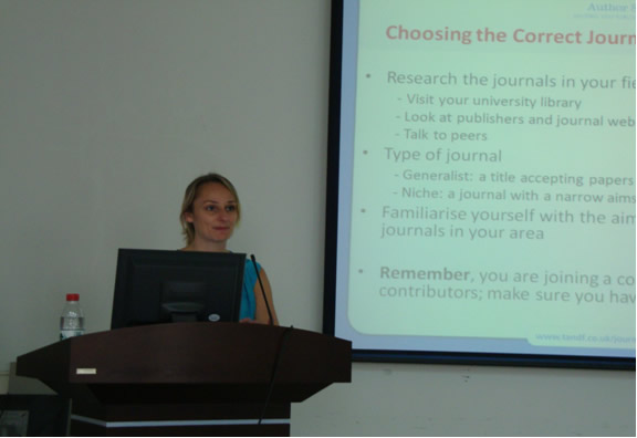 2012年5月30日,泰勒弗朗西斯(Taylor & Francis Group)出版集团亚洲区期刊出版人蕾切尔•桑斯特女士(Rachel Sangster)到访外文系,在文南楼116室作题为“论文发表前的准备及作者支持”的报告。外文系教授罗选民主持报告会。校内外师生30余人听取报告。