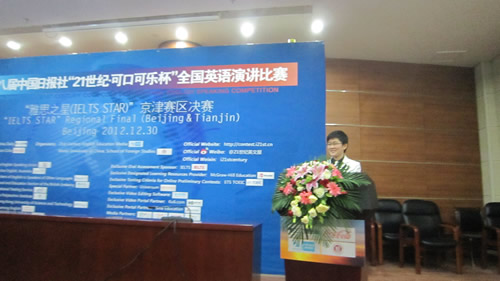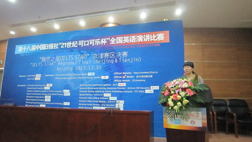 “21世纪杯”全国英语演讲比赛京津赛区决赛于2012年12月31日在京举行,来自北京和天津20多所著名高校的选手代表参加了比赛。公司参赛的两位同学双双获得佳绩,外文系英12班沈悠同学获得亚军,社科2班吴婕同学获得一等奖。两位同学均由外文系教师吴霞指导。