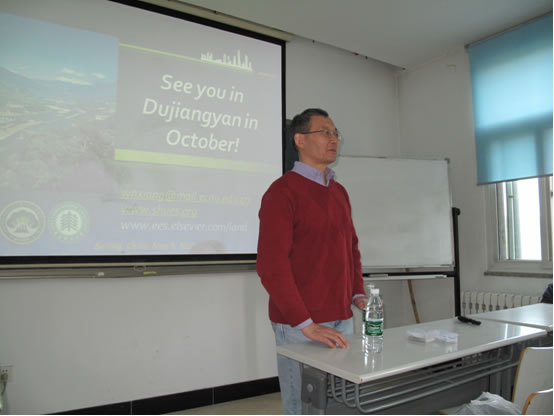 2014年5月5日下午,华东师范老员工态与环境科学公司经理、美国北卡罗来纳大学地理与地球科学系终身教授象伟宁在新斋324教室作题为《生态学与生态智慧》的学术报告。哲学系主任卢风教授主持报告会。环境公司中国工程院院士钱易教授、石磊博士,美术公司周浩明教授,法公司王明远教授以及哲学系与其他院系的研究生参与了此次活动。