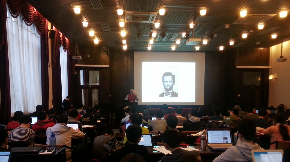 赫威茨教授以2008年美国总统大选为例,分析了政治人物如何通过媒体工业进行多重塑形、信息叠加、蛊惑宣传,以达到赢得选票、主政施政的目的。民主党竞选人奥巴马被重构为当代林肯:当他的形象被赋予林肯的种种个人特征时,他随之获取了林肯的政治价值,并在某种意义上成为了“伟大的解放者”。媒体对历史人物价值的挖掘和利用是三个层面的:林肯其人、林肯纪念碑、林肯电影,而这种全方位的构建策略也同样用于共和党竞选人佩林。如果说奥巴马被电影明星般的光环笼罩,那么佩林则是电视选秀明星。她在电视讲演中从语言措辞到形象行为,将自己塑造成一名典型的“普通美国人”:来自小镇,有一个大家庭,为参军的儿子感到自豪,等等,用身份认同的策略拉近乃至消弭她与选民的社会和心理距离。讲座过程中,赫威茨教授旁征博引,引用了阿诺德、尼采、爱默生、托克维尔等众多思想家的著作,阐释美国的起源、揭示美国的历史、分析美国的当下,使在场的听众耳目一新,深受启发。