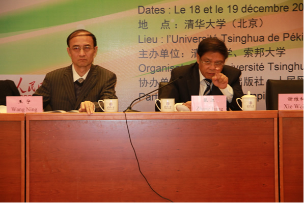 开幕式后,张江、巴斯蒂、王宁和弗朗哥分别作了主题发言。 张江在发言中指出,在中国改革开放三十五年里,大量的西方理论思潮蜂拥进入中国,对中国当代的文化和文学建设产生了一些积极的作用,但是应该指出的是,西方当代文论也给中国的文学理论批评带来了一些消极的影响,例如针对纷纭复杂的文学现象,理论的提出者不去仔细阅读文学文本,从文学文本中提升出理论,而是从非文学理论的视角出发来肢解文学文本,或理论先行,通过非文学理论对文学现象进行强制性阐释,得出的结论实际上远离文学研究。为了使文学研究和文学批评健康的发展,中国的文学理论家和文学研究者应该反思这一现象,以便提出中国自己的文学理论批评话语。巴斯蒂院士在发言中认真地考察了人文主义这一术语在法国和中国语境下产生的历史及不同的意义,认为人文主义在不同的时期和不同的国度应该有不同的表现形式,因此对之的理解也应该是多元的。王宁在发言中,追踪了三位法国理论家在中国的批评性接受:萨特始终对中国有着友好的感情,他在中国的接受也经历了波澜曲折;德里达作为一位解构理论家,他的理论对中国的文学批评和翻译研究均产生了较大的影响;巴迪欧作为一位深受马克思主义和毛泽东思想影响的法国左翼知识分子,对中国革命始终抱有一种浪漫的情怀。这三位法国理论对中国理论家的影响同时也启迪了中国理论家对中国自己的理论话语的建构。他接着提出了自己建构的世界诗学理论,引起了与会专家学者的强烈兴趣。弗朗哥在发言中则梳理并考察了欧洲历史上浪漫主义与人文中心的平行发展和互动关系,并描述当今的比较文学学者的人文关怀。