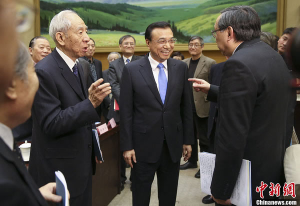 中新社消息,2015年2月9日,中共中央政治局常委、国务院总理李克强在中南海紫光阁向新聘任的国务院参事和新聘中央文史研究馆馆员颁发聘书。李克强代表党中央、国务院,向各级政府参 事、文史馆馆员表示感谢和新春问候。颁发聘书后,李克强与大家座谈。林毅夫参事、陈来馆员、张玉香特约研究员等就“十三五”要解决的关键问题、搞好中华民族心灵建设、实施村庄整治启动农村内需、促进对外开放、建设工业强国等提出建议。李克强对大家的发言积极回应。李克强指出,参事室和文史馆人才荟萃,文化底蕴丰厚。希望大家用厚实的文化积淀和广阔的全球视野,从五千年中华文明中汲取精神营养,弘扬中华民族优秀传统文化,加强国际文化交流,不断提升决策咨询质量和内涵。要围绕发展紧跟时代、面向未来的先进文化,多建诤言、善谋良策,促进形成强大的社会道德力量,提升民族凝聚力和创造力,为实现经济提质增效、更好展现日新日进的国家精神风貌提供支撑。