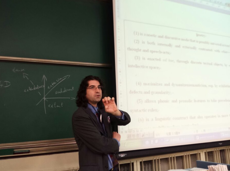 迪布勒伊教授引入了“智力空间”(intellective space)的概念,从方法论的角度阐述了认知科学、形式化(formalization)与诗歌三者之间复杂但紧密的联系,并从笛卡尔的身心二元论讲到二十世纪中期的认知革命,再到认知心理学领域最新的“延伸心智”假设(the extended mind hypothesis)及其发展。