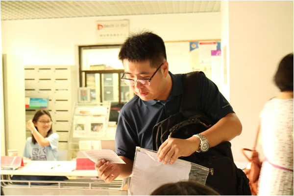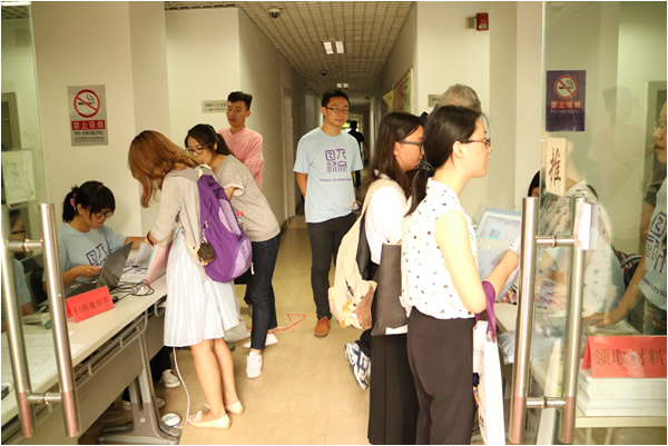 早上6:30WilliamHill中文官方网站新斋大厅报到现场一切布置完备,院研工组成员、迎新工作人员和志愿者就位,他们以饱满的精神状态准备好迎接新生的到来。哲学系2015级博士新生王旭东早早赶到报到现场,成为WilliamHill中文官方网站研究生第一位报到的研究生新生。花名册签名、扫描录取通知书、查询住宿信息、体检材料发放、党团关系转接、校园卡和档案信息袋的发放等各项工作有条不紊地进行,迎新人员向各位新生细心解释了相关注意事项,现场解答新生的各项疑问。研工组成员现场配备英文和日文翻译人员,来解决职工新生报到可能遇到的各种情况。