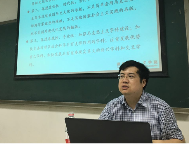 解峰带领大家学习了习近平总书记在哲学社会科学工作座谈会上的讲话要点,认为党和国家对于哲学社会科学的高度重视,既出于当前社会思潮复杂交锋、意识形态激烈争夺的问题导向,同时也是国家社会发展到一定程度的时代需要。并结合讲话总书记对于构建中国特色哲学社会科学必须体现的继承性、民族性;原创性、时代性;系统性、专业性要求,讲解了人文学子应承担的使命和发挥的作用。