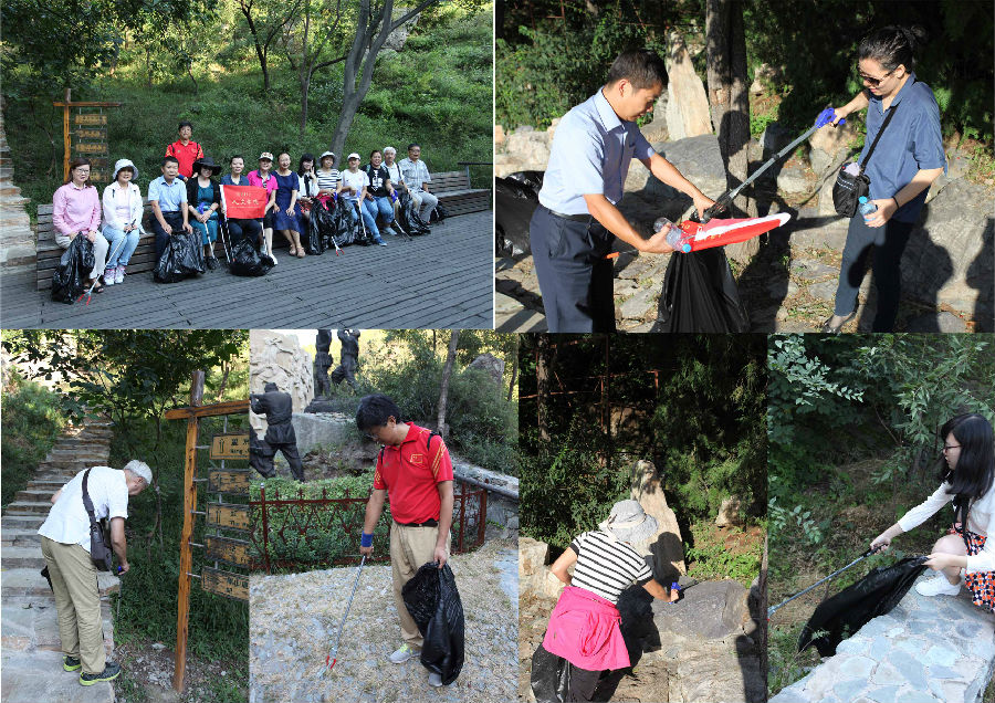 百望山森林公园位于北京市颐和园北3公里处,是距市区最近的森林公园。这里乔木、灌木交错,森林茂密,植被覆盖率高达95%以上,空气格外清新。到达目的地后,大家纷纷带上院工会提前准备好的垃圾夹、垃圾袋和手套开启了环保之旅。老师们在行进途中一边捡拾沿路垃圾,一边享受“天然氧吧”宜人的环境。一路上欢声笑语,累了便在路边的休息区小憩一会儿,途经黑山扈战斗纪念园,大家都不约而同地停下脚步,合影留念。