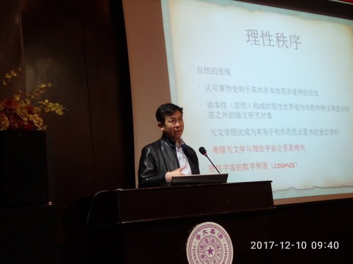 第一个报告是科学史系主任吴国盛教授的“希腊天文学的起源”,援引法国希腊思想史家韦尔南的观点,提出希腊人对圆的几何偏爱来源于希腊人的城邦政治生活。