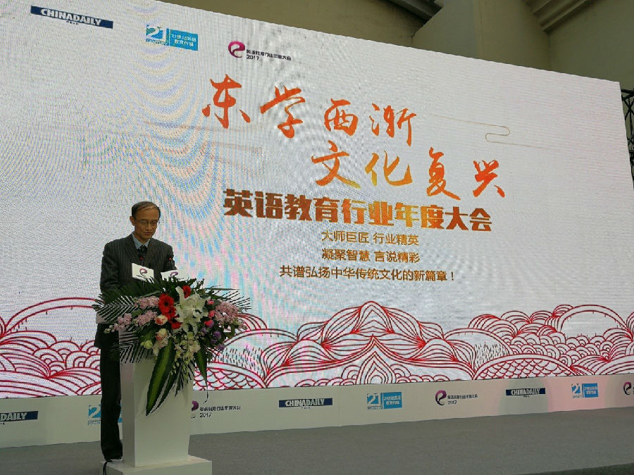 1月12日下午,由中国日报社和21世纪英语教育传媒、中国比较文学学会等单位和学术团体共同举办的“东学西渐、文化复兴——英语教育行业年度大会”在中国日报社阳光大厅举行。出席大会的有来自全国各地从事英语教育的业内人士以及国内主要新闻媒体的记者120多人。