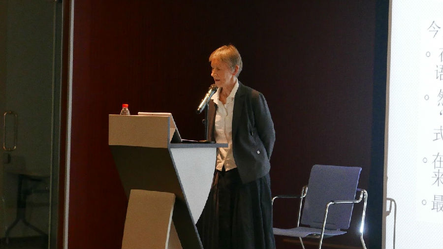 讲座下半场柯理思把焦点放在叙事体和会话体的不同所带来的语法差异,指出典型的对话语体是“说话”,说话人和听话人在同一个时间和同一个空间里互相交流,第一和第二人称的使用频率高,交际环境有利于提问、建议、命令、禁止、劝阻等想获得对方的某一个反应(语言反应=回答,或行动)的语言行为,说话人也可以表达自己的意愿或者自己的意愿或者自己的主观评价,未然句多;典型的叙事语体以第三人称为主,叙事的对象也可以是非特定的多数人,时间和空间也可以不同,已然句多。柯理思教授举出三个事例进一步阐释叙事体和会话体的不同带来的语法差异:汉语的肯定祈使句缺乏专用标记、“你问问看” 中“看”的“体”功能、表未然义的“再”。最后,柯理思教授回到汉语教学问题中来,强调在汉语教学中要重视句类在交互式语体里出现的语法意义。
