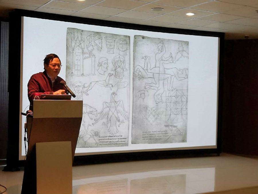 此次讲座从欧洲中世纪作家和画家维拉尔的《构造:命运之轮》开始切入,追溯了这个习画范本背后的西方绘画传统。高建平指出,在拉维尔的插图示例中,可以看到包括三角形、方形和五边形等几何图形在绘制人物和动物形象中发挥的重要作用。这个重视几何与数学的传统,可以追溯到毕达哥拉斯的“数是世界的本源”的哲学思想。这种用几何图形来构造图画和呈现万物的实用方法,背后体现了一种根本性的审美观念,即认为几何与数学为绘画提供了永恒的美。
