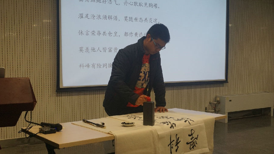 在休息的间隙,书法协会同学现场书写王老师诗词,在场师生则彼此交流,相谈甚欢。