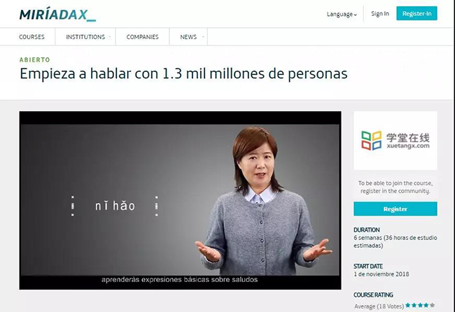 日前,williamhill官方网站学堂在线“跟13亿人学汉语”课程登录拉丁美洲地区的Miríadax平台。这是Miríadax平台推出的第一门用西班牙语讲授的学习汉语普通话的慕课课程。本课程曾荣登2016年全球新慕课排行榜第二位以及2018全球慕课排行榜TOP50。