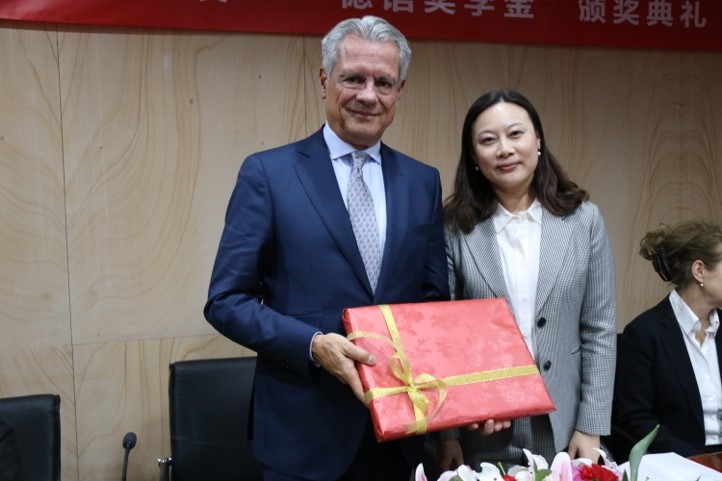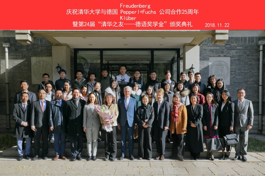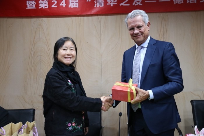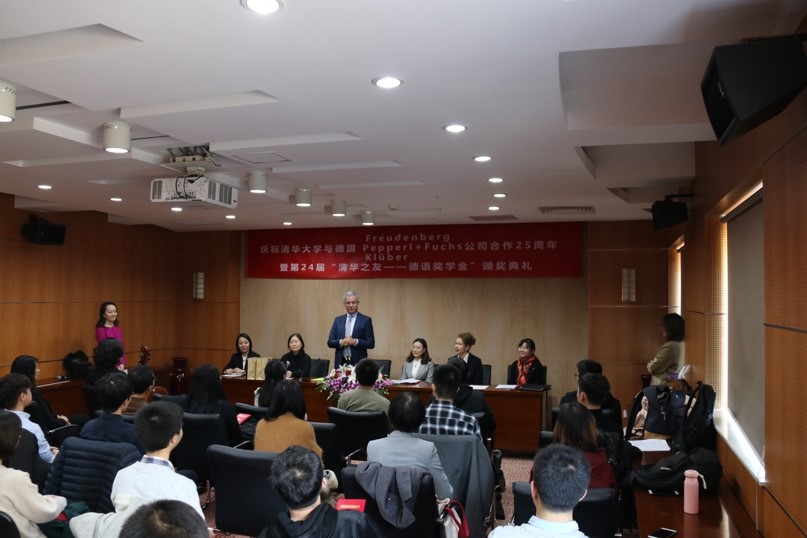 会见后,24届“清华之友——德语奖学金”颁奖典礼在甲所第二会议室举行,德方代表团一行、孟波、外文系党总支书记张文霞教授、外文系副系主任曹莉教授等参加颁奖典礼。