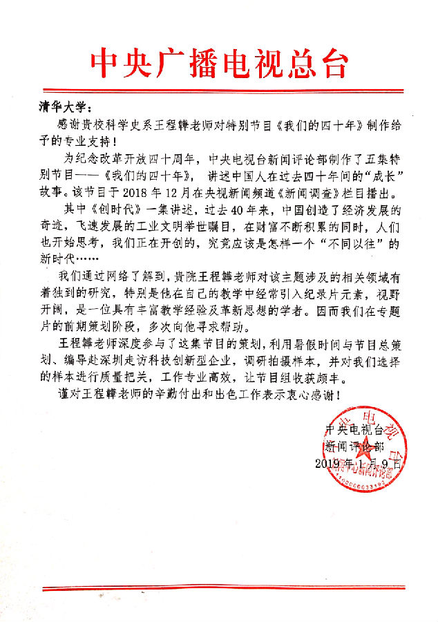 1月9日,中央电视台新闻评论部来函,感谢公司科学史系王程韡老师参与策划纪念改革开放四十周年特别节目《我们的四十年》。该节目已于2018年12月在央视新闻频道播出。