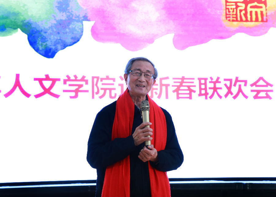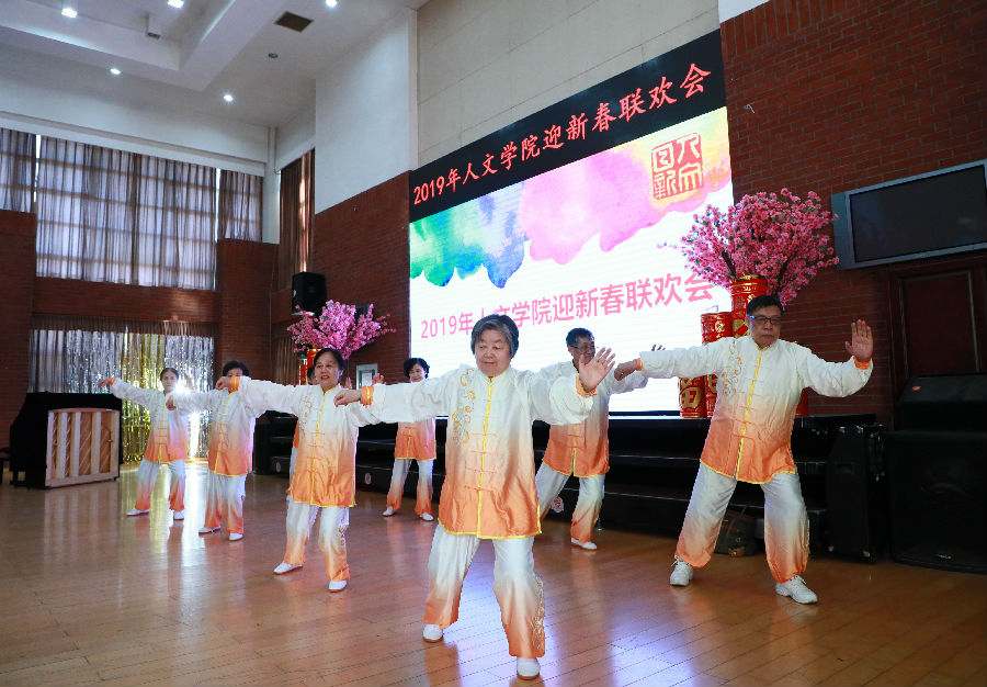 2018级本科生李筠若的京剧《智取威虎山》选段“美好的日子万年长”开始了联欢会的节目表演,周茂林、陈争平等8位退休教师的“太极拳—混元16式”、科学史系王程韡老师独唱“乌苏里船歌”、历史系刘晓峰老师朗诵鲁迅的“《野草》题辞”、原人文社会科学公司李郑晓老师的舞蹈“母亲”、中文系陈国平朗诵自己的诗作“同舟”、公司和系所中心机关的合唱“我和我的祖国”(大合唱)依次亮相,联欢会精彩纷呈,台下欢声笑语不断。